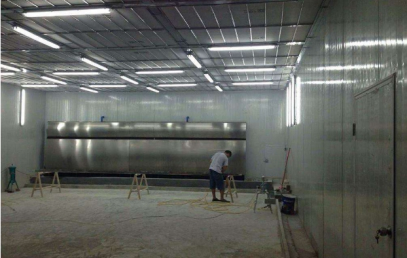 家具廠噴漆房房體采用保溫噴塑墻板,密封、保溫性能好,房體側面裝有工作門,方便工作人員進出,鋁合金包邊大門,門中央裝有觀察窗,可隨時觀察房內動態(tài)。噴漆作業(yè)時,外部空氣經過初級過濾網過濾后由風機送到房頂,再經過頂部過濾網二次過濾凈化后進入房內。房內空氣采用全降式,以0.2-0.3m/s的速度向下流動,使噴漆后的漆霧微粒不能在空氣中停留,而直接通過底部出風口被排出房外。