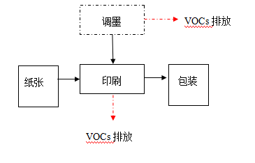 該印刷公司生產(chǎn)工藝有印刷工藝、復(fù)合工藝。生產(chǎn)過程的VOCs排放環(huán)節(jié)主要為印刷生產(chǎn)過程的調(diào)墨、印刷和復(fù)合生產(chǎn)過程的涂布、復(fù)合。具體的生產(chǎn)過程VOCs產(chǎn)排污環(huán)節(jié)如下圖所示。