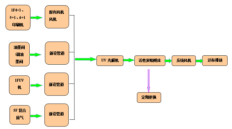 目前該印刷公司采用的是UV光解凈化器,由于風(fēng)機(jī)選型不合理,排風(fēng)量小,處理設(shè)備體積偏小,凈化過濾風(fēng)速太快,阻力偏大,導(dǎo)致整個(gè)系統(tǒng)排風(fēng)不暢,出現(xiàn)竄風(fēng)現(xiàn)象。為響應(yīng)環(huán)保要求,最大限度減少環(huán)境污染,對此我們?nèi)f川環(huán)保公司為其提供廢氣處理設(shè)施提標(biāo)改造解決方案。