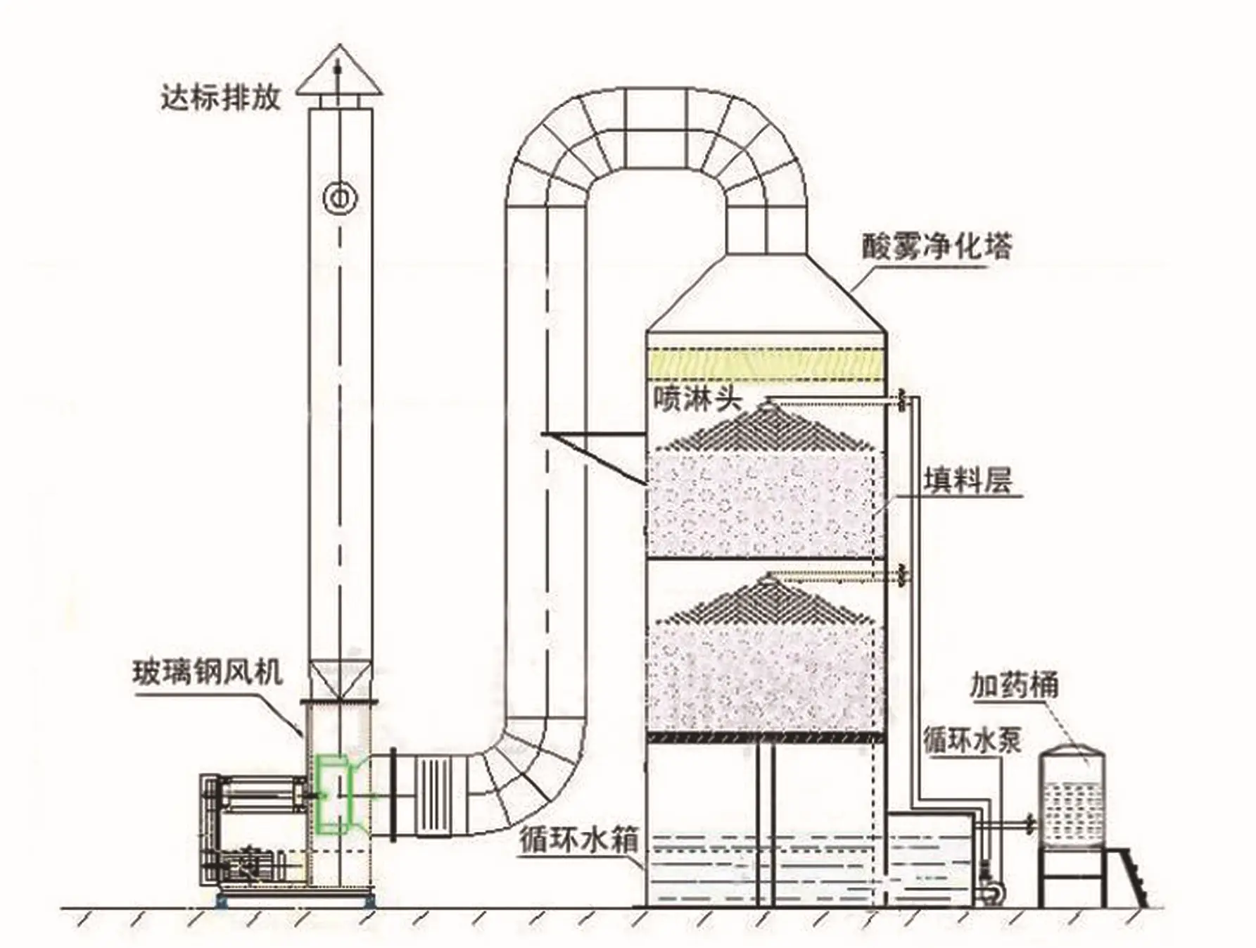 噴淋塔為實施噴淋法治理廢氣或回收原料的重要組成設(shè)備,故又稱為水洗塔、洗滌塔、凈化塔。根據(jù)廢氣類別及噴淋液的不同可分為水噴淋塔、酸噴淋塔、堿噴淋塔、油噴淋塔、水膜除塵/濕式除塵器;按形狀也可分為立式洗滌塔、臥式洗滌塔;按材質(zhì)又為分PP洗滌塔、玻璃鋼洗滌塔等。 噴淋塔運行方式是不斷將酸霧廢氣由風管引入凈化塔,將廢氣與氫氧化鈉吸收液進行充分接觸吸收中和反應(yīng),酸霧廢氣經(jīng)過凈化后,再經(jīng)除霧板脫水除霧后由風機排入大氣。吸收液在塔底經(jīng)水泵增壓后在塔頂噴淋而下,之后回流至塔底水箱內(nèi)如此進行循環(huán)使用。凈化后的酸霧廢氣可以達到地方排放標準的排放要求,也會低于國家排放標準。