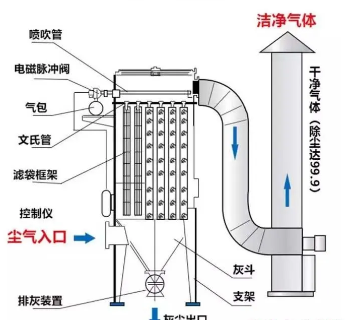 含塵氣體由風機通過吸塵管吸入箱體,進入濾袋過濾,粉塵顆粒被濾袋阻留在表面,經過過濾的凈化氣體由出風口排出,可直接排放在室內循環使用,也可根據需要排出室外。整個除塵過濾是一個重力,慣性力,碰撞,靜電吸附,篩濾等綜合效應的結果。除塵器連續工作一段時間后,濾袋表面的粉塵不斷增加,繼而進行清灰,粉塵抖落在集塵器(抽屜)中,再由人工進行處理 。