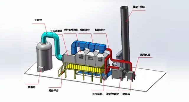該凈化裝置是根據(jù)吸附和催化燃燒兩項技術組合而成,不僅能更加節(jié)能還提高了廢氣治理的效率,也就是活性炭吸附濃縮催化燃燒法。