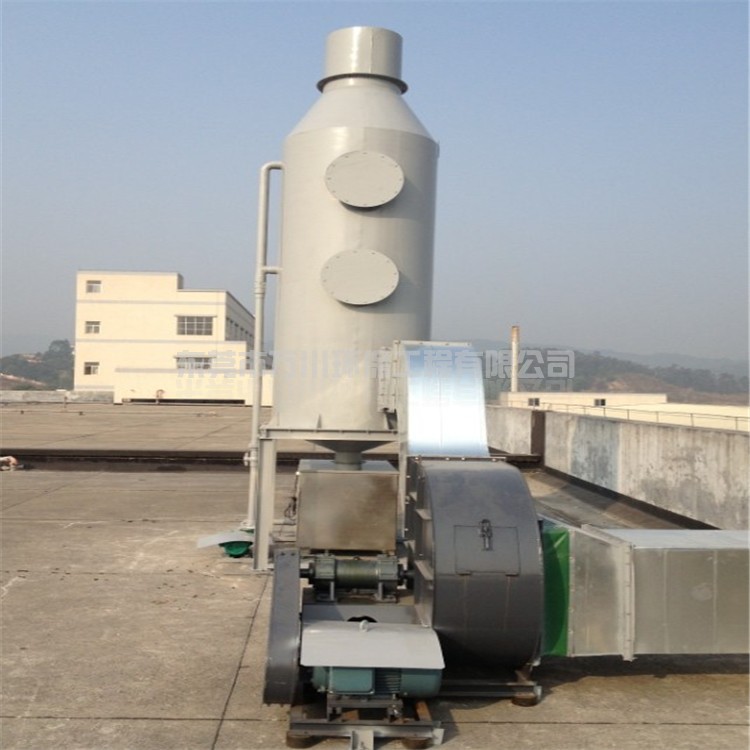含塵廢氣在風機的作用下,含塵氣體從塔體下方進氣口沿切向進入濕式除塵器噴淋塔,在風機的作用下,迅速充滿進氣段空間,然后塔頂位置的噴淋頭向下噴水,水與含塵廢氣接觸,使得空氣和粉塵分離,達到除塵的效果。濕式除塵器噴淋塔具有結(jié)構(gòu)簡單、造價低、占地面積小、凈化效率高等優(yōu)點,能夠處理高溫、高濕的氣流,將著火、爆炸的可能減至最低。