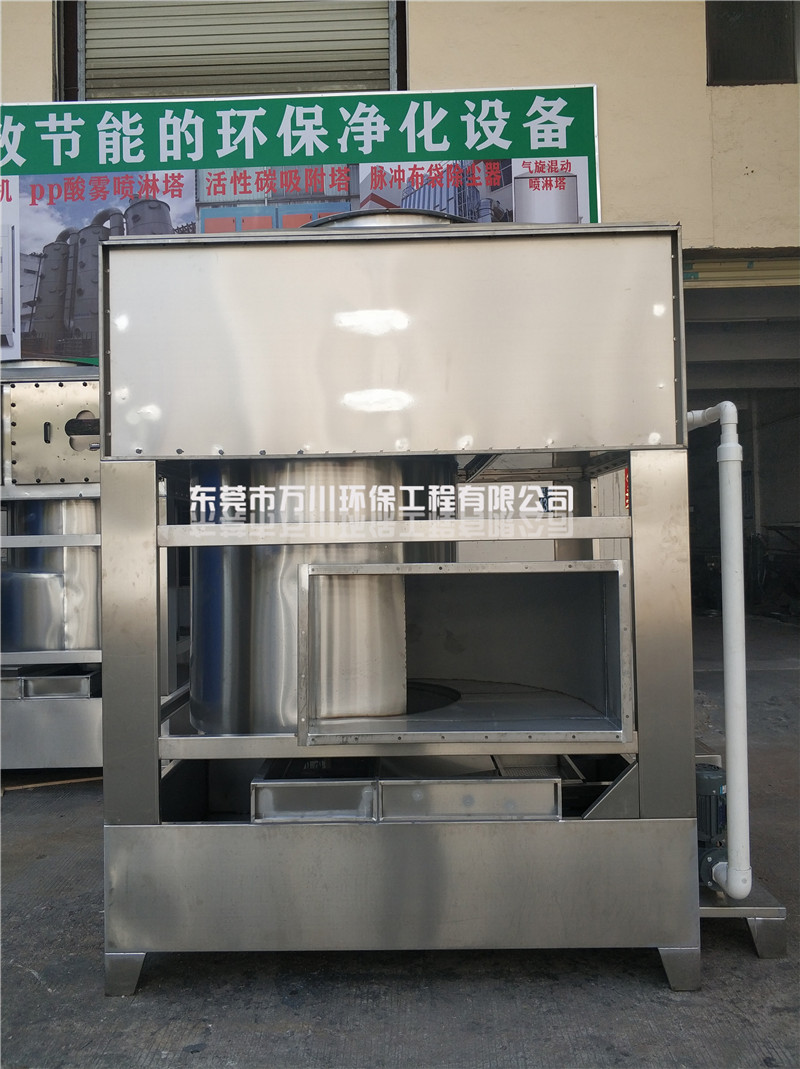 當(dāng)生產(chǎn)作業(yè)時(shí),煙塵廢氣在風(fēng)機(jī)牽引力的作用下進(jìn)入高速混流導(dǎo)軌裝置,煙塵廢氣在離心力的作用下進(jìn)行氣液乳化反應(yīng),在混流液的高速旋轉(zhuǎn)狀態(tài)下,污染物與旋轉(zhuǎn)液體充分混合吸收相溶增加煙塵比重,利用旋流裝置設(shè)計(jì)好的離心力達(dá)到氣液分離,分離后的氣體進(jìn)入環(huán)保填料吸附層,螺旋噴頭噴出的對(duì)應(yīng)溶劑均勻分布在填料上,由于填料的合理設(shè)計(jì),污染物浸透在填料的時(shí)間較長(zhǎng),與反應(yīng)液在專(zhuān)用環(huán)保填料表面有充分的氣液相溶反應(yīng)時(shí)間,從而達(dá)到達(dá)標(biāo)排放的目的。