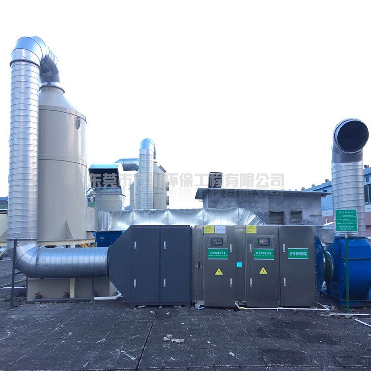 噴漆廢氣主要的成分為有毒的有機氣體和部分粉塵顆粒,首先經過通風管道將廢氣輸入噴淋塔內進行清洗除去粉塵顆粒物,進到干濕過濾器進行干燥和過濾剩余的粉塵,干燥后進入UV光解凈化器,利用UV光解凈化器的原理把廢氣分子裂解,生成水和無機物。其次進入活性炭吸附塔,利用活性炭的多孔性存在吸引力,當活性炭與廢氣接觸時活性炭會吸附廢氣分子,最后污染物被處理過后即可排放。