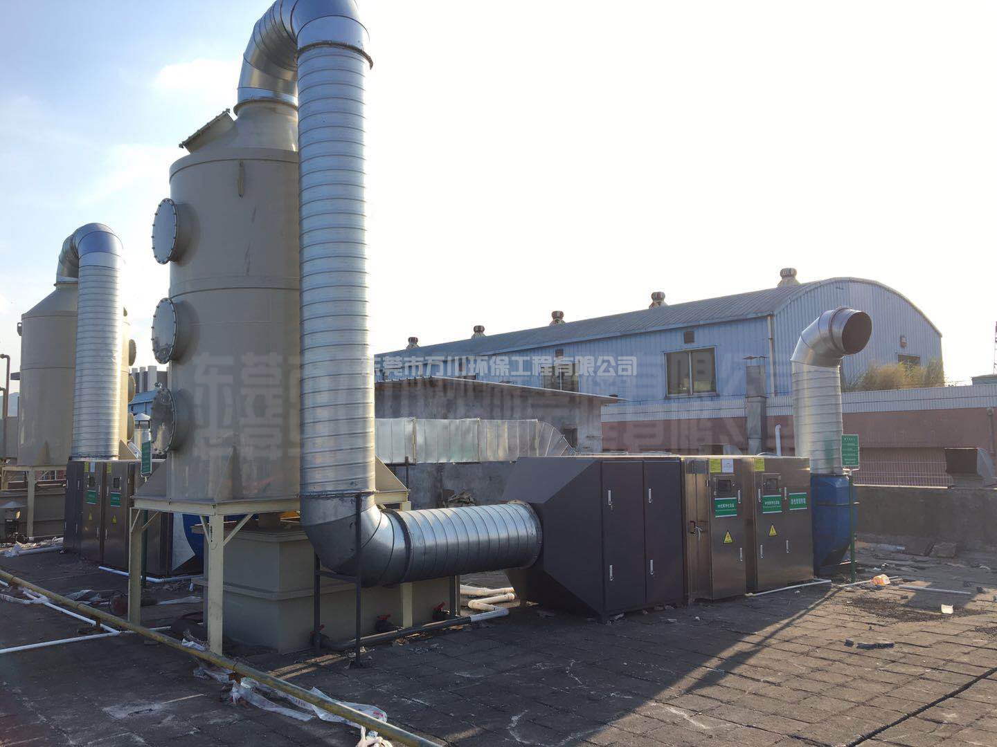 (一)噴淋塔是以利用水作為吸收劑,它由塔體、噴淋系統(tǒng)、視窗口等組件組成,噴漆廢在風機的作用下進入噴淋塔內(nèi),噴淋塔系統(tǒng)向下噴水,水與粉塵結合,最后沉淀到污水池里。